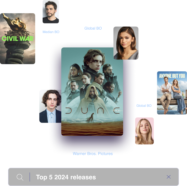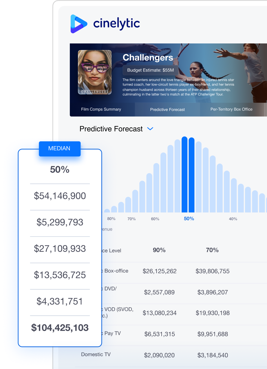 As pioneers in entertainment AI, our platforms support the entire filmmaking value chain, from script coverage (Callaia) to in depth go-to-market forecasts (Cinelytic), to selling film/TV rights on the leading global marketplace (RightsTrade).