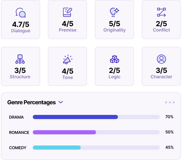 Detailed notes and scores on the premise, originality, dialogue, structure, logic, tone, conflict, pacing, and craft